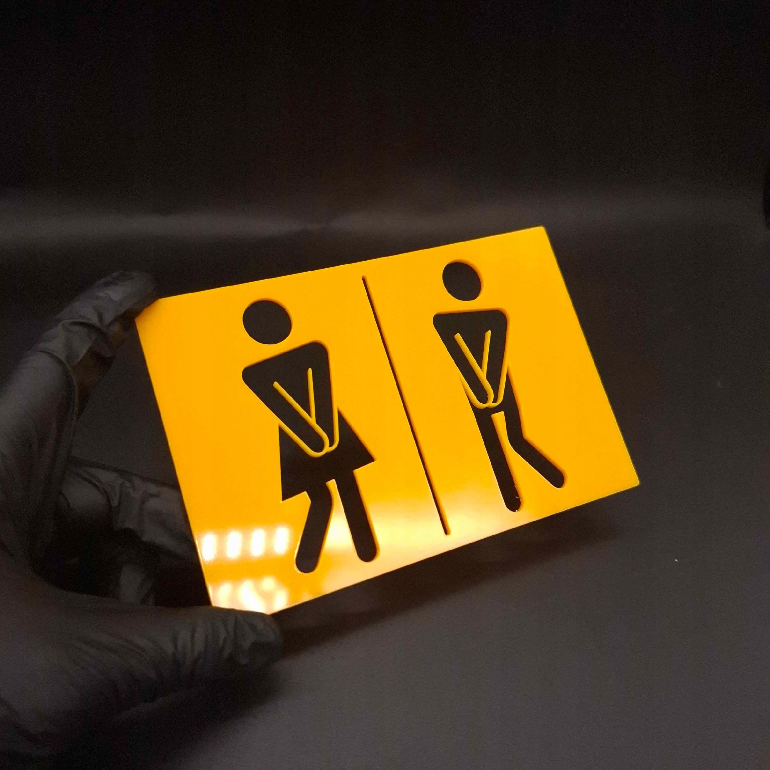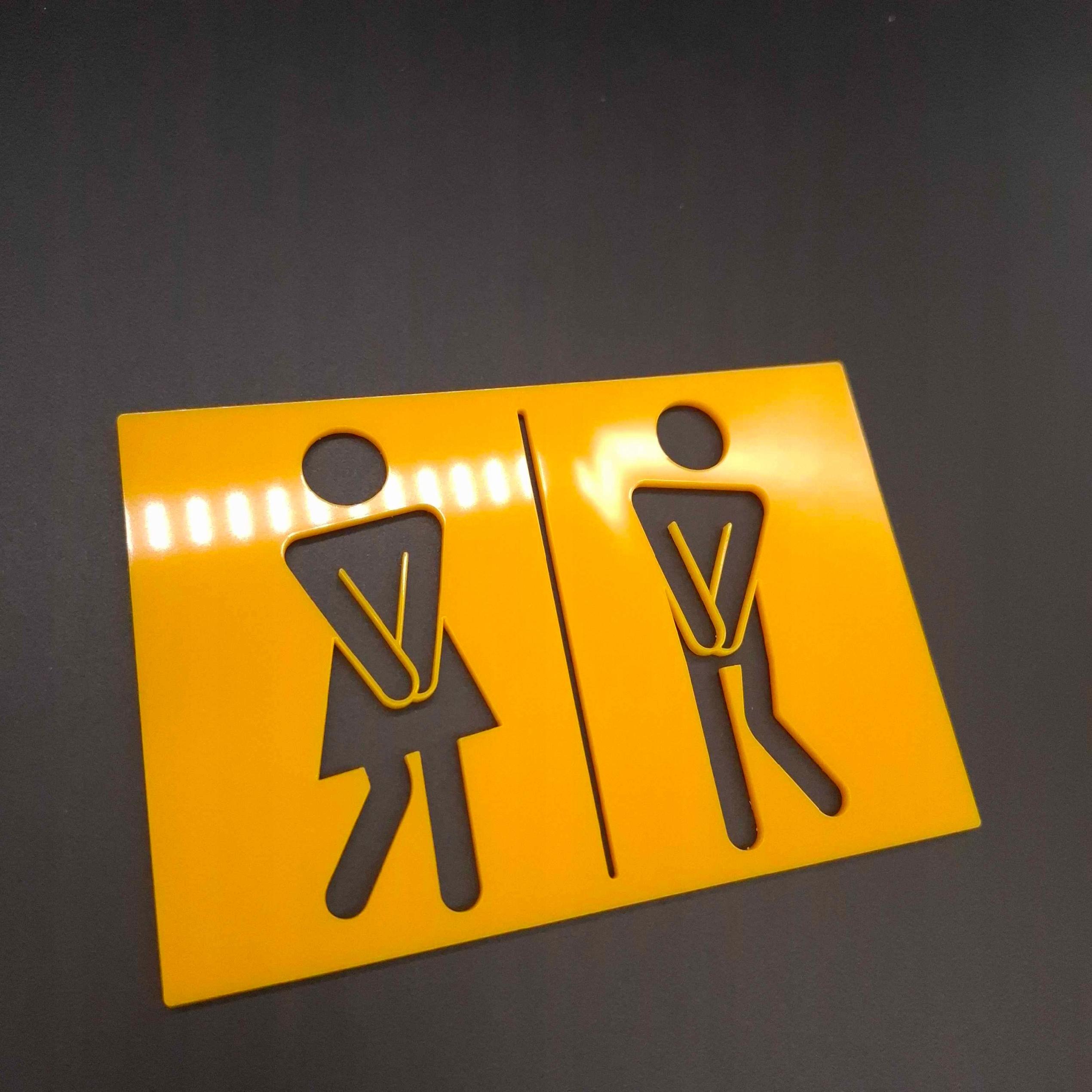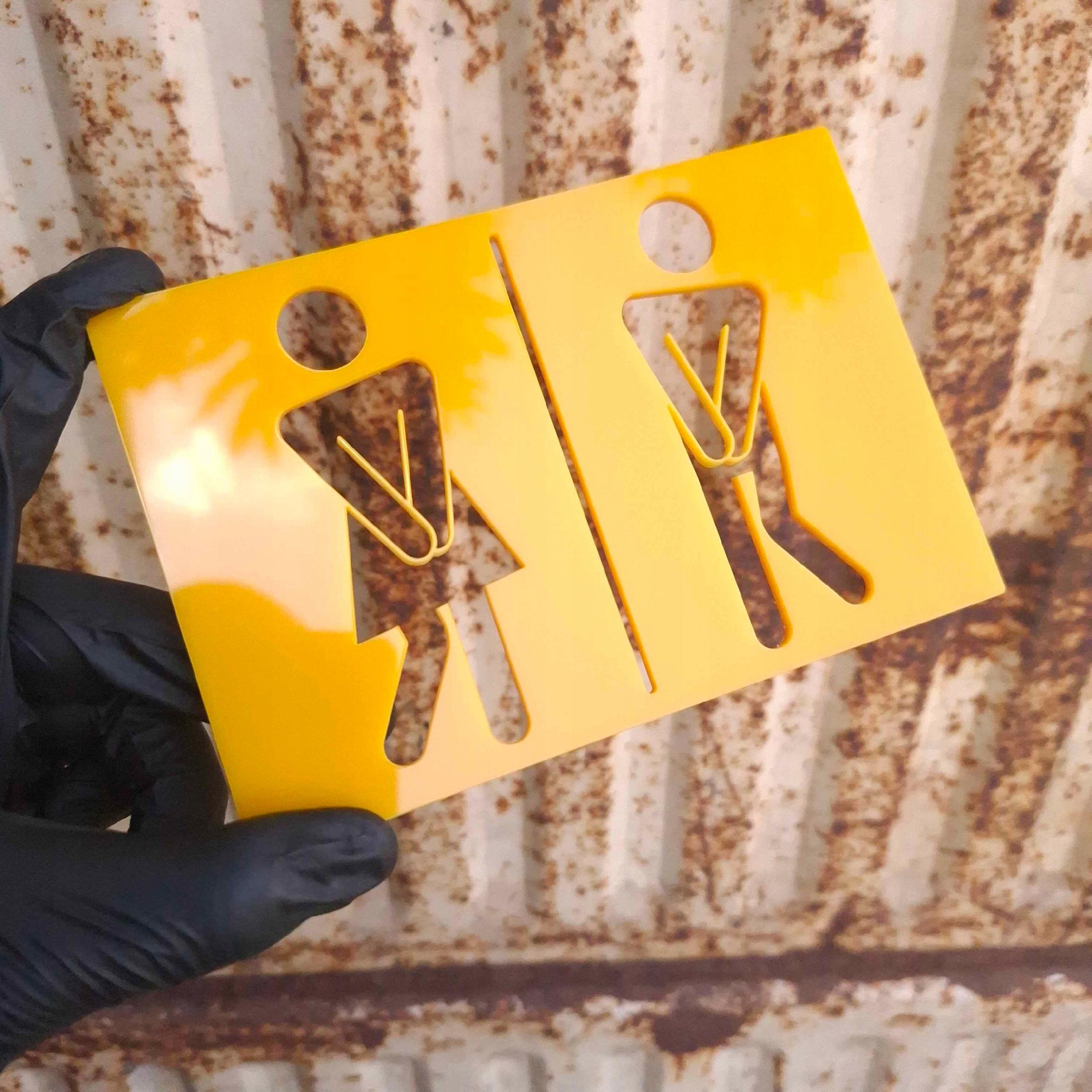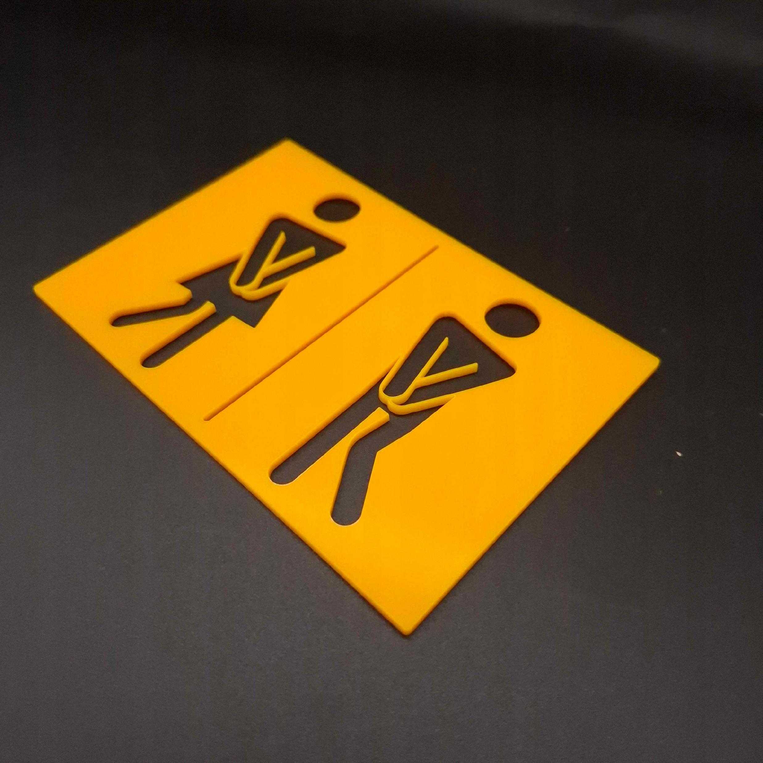 Czytelny piktogram, który prowadzi gości bez słów. Wykonana z trwałej plexi i wycinana laserowo, ma gładkie, eleganckie krawędzie. Na zdjęciu pokazujemy wersję w intensywnym żółtym, ale przygotujemy także czarną, białą, szarą, ze złotym lustrem lub w innym kolorze.