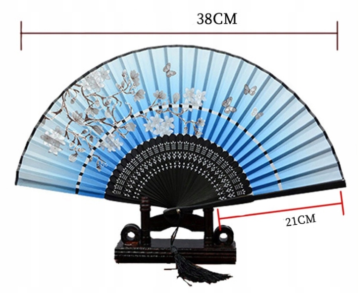 Po rozłożeniu szerokość wachlarza wynosi około 38 cm, co zapewnia skuteczne chłodzenie w upalne dni.
