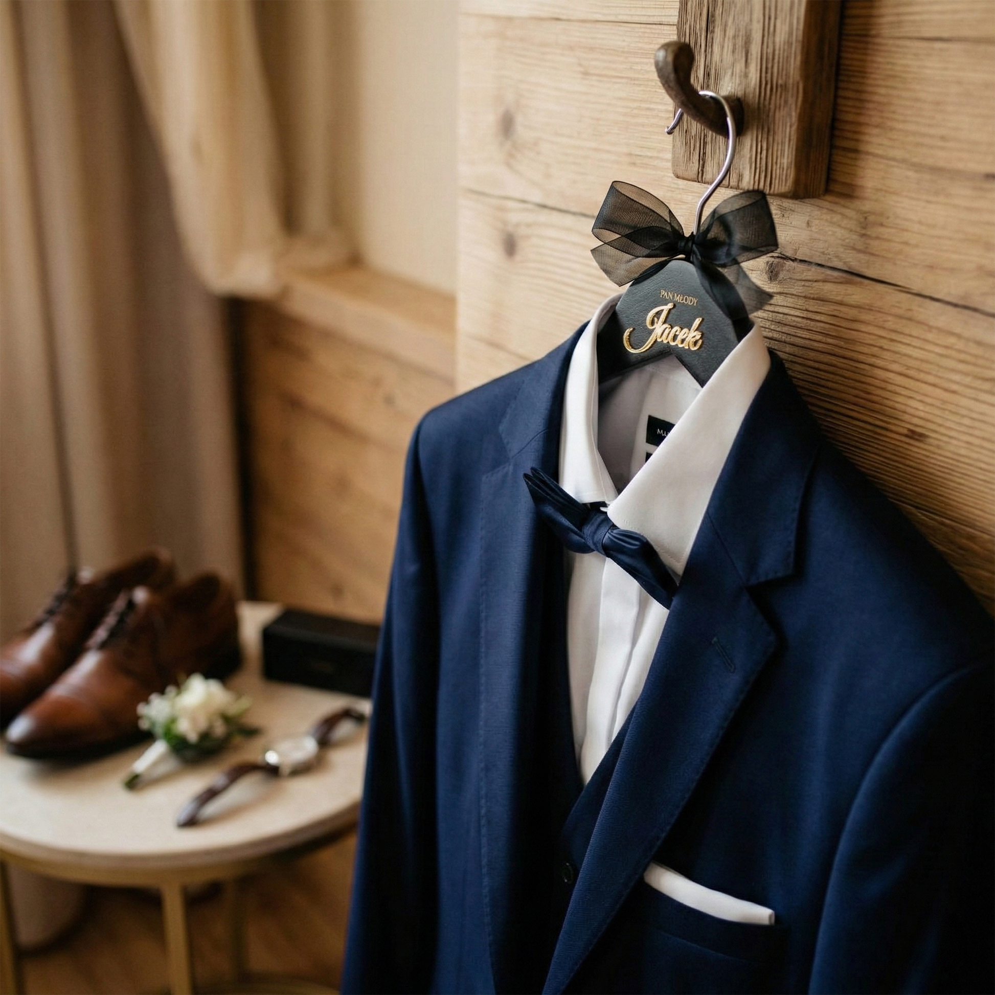 ✨ Personalizowane wieszaki ślubne z imieniem zostały zaprojektowane z dbałością o każdy detal. Klasyczna kolorystyka bieli i czerni w połączeniu ze złotym napisem prezentuje się niezwykle elegancko i doskonale pasuje do stylu glamour, klasycznego oraz nowoczesnego.